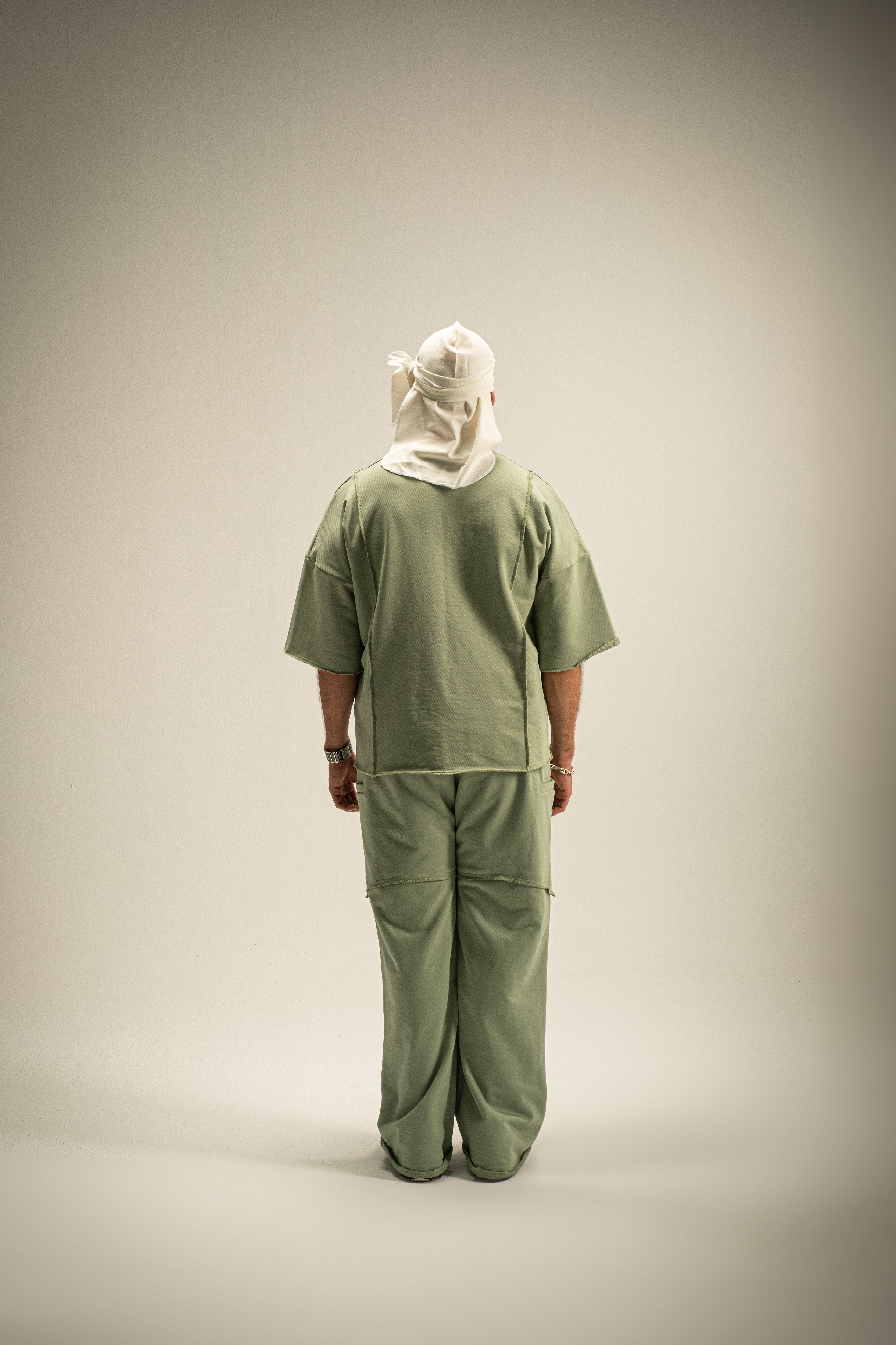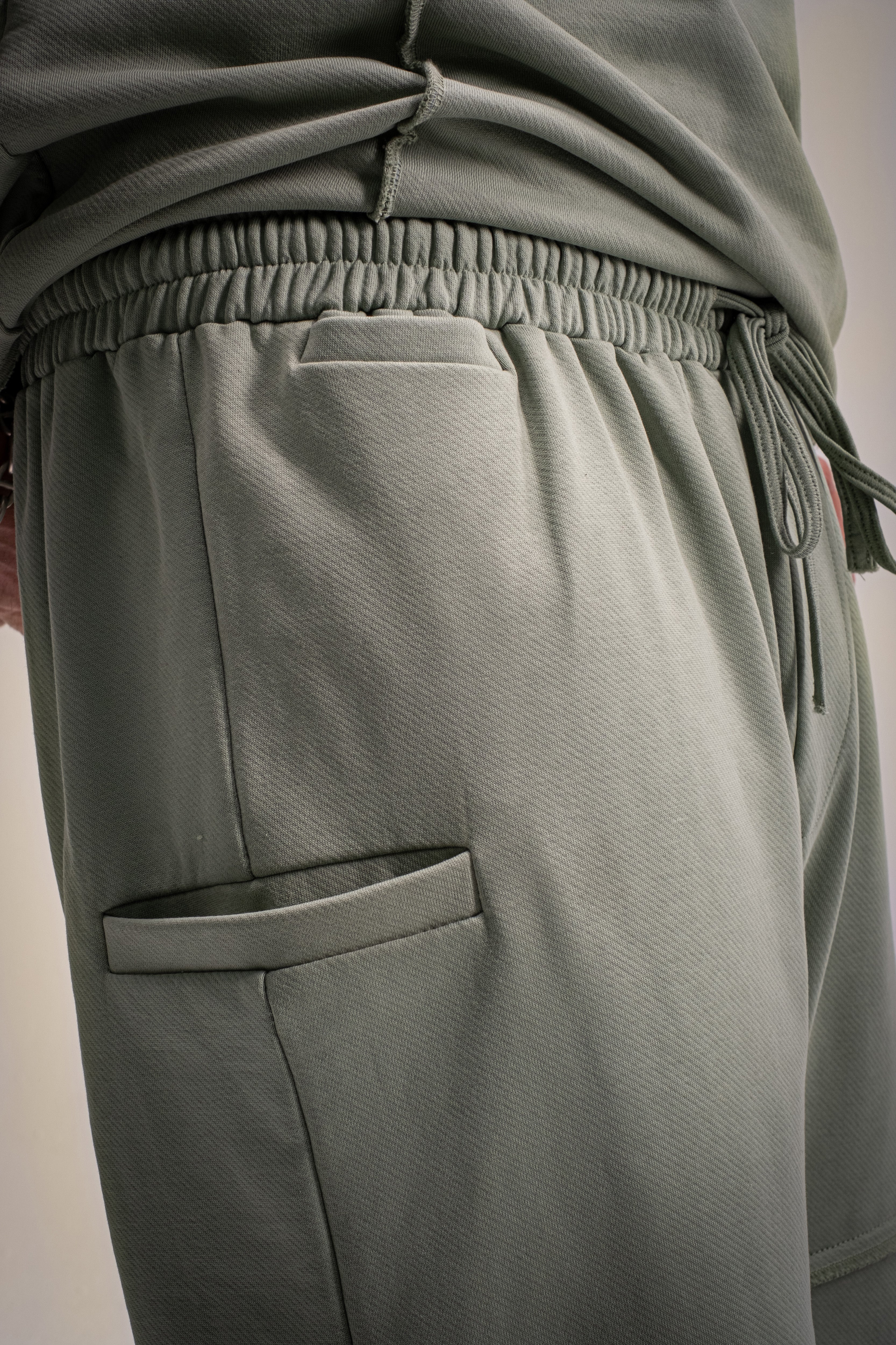 Designed for movement and ease, these wide-leg pants in mint French Terry offer relaxed tailoring and visible seams for a modern twist.